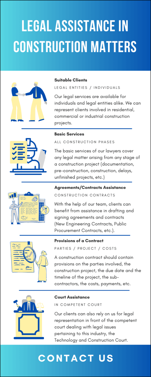 Our clients can request to be represented by our team at any stage of a construction project. Besides providing legal advice and legal assistance on the legislation regulating a construction project, our team of lawyers can assist any party in any of the following:
