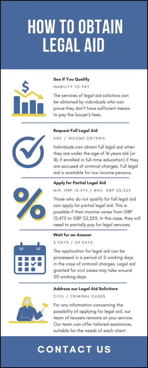 • for an income of minimum GBP 12,475 to maximum GBP 22,325, it is required for the person who needs legal aid to support a part of the costs (for criminal aid costs);