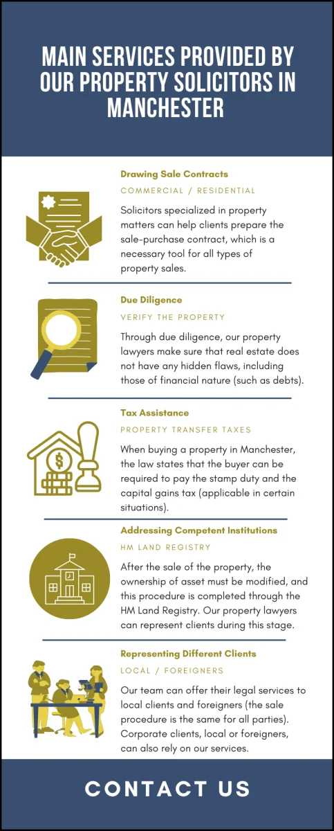 Our team of property solicitors in Manchester can provide full legal representation to any party interested in purchasing a property in the UK and common services refer to any aspect involved prior to the purchase of the property (meaning, before the sale contract is signed), during the purchase of the property and the steps one must follow after the change of ownership happened, when the contract is in force.